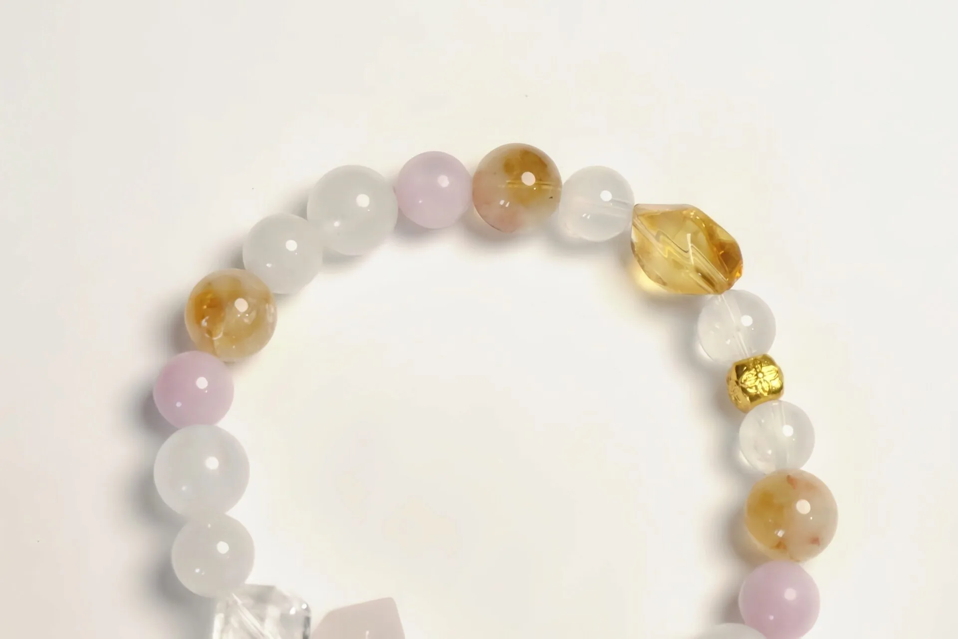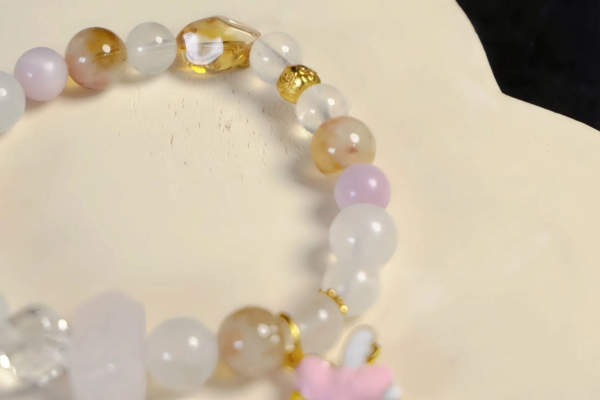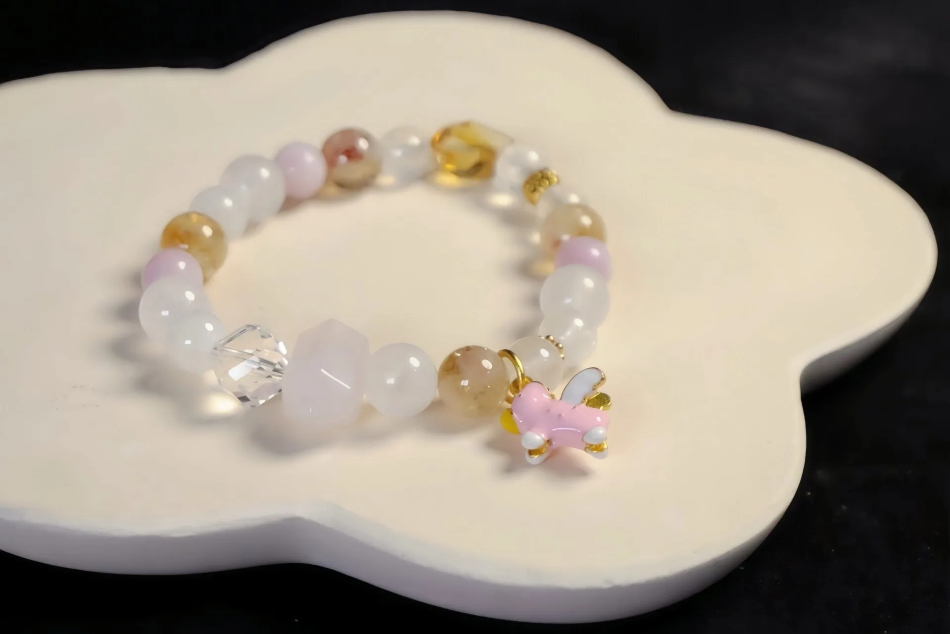 这款手链由水晶和镀铜装饰制成